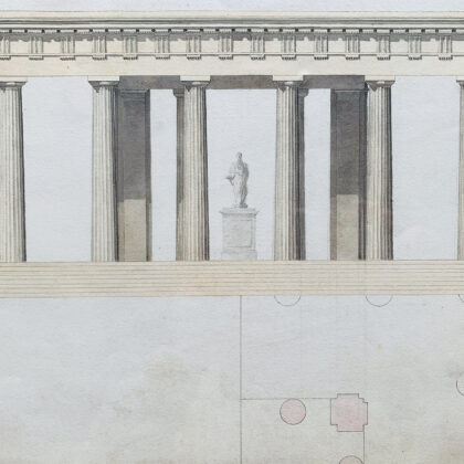 An Architect’s design for a Doric Mausoleum, with a statue on a tall plinth, elevation and plan